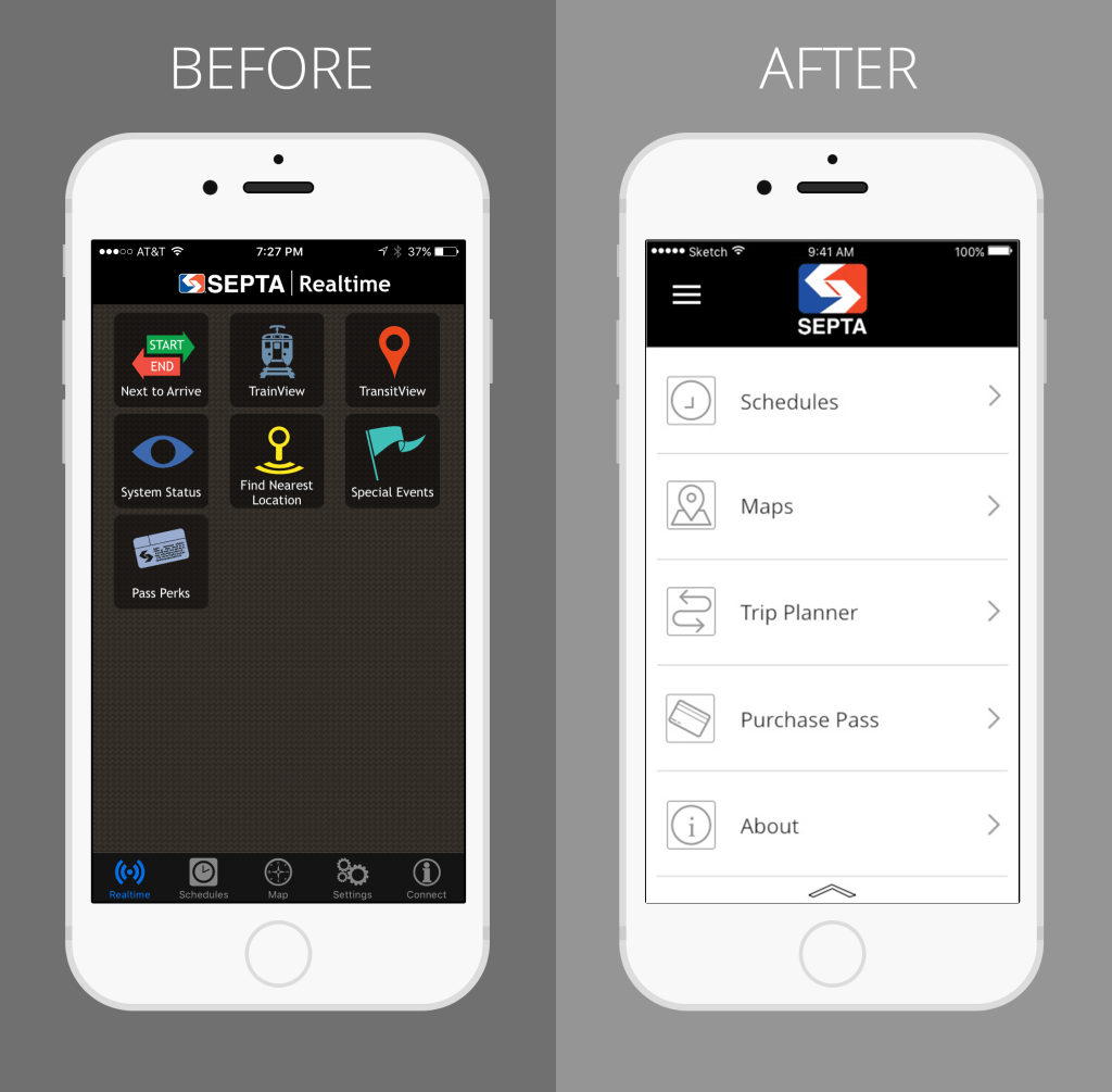 This fictional project took a look at the current site and identified pain points by using the app myself and talking to some family members who commute with SEPTA regularly. I drew up a few scenarios before deciding which new features would be absolutely necessary. I knew I wanted a clean, simple, easy to use design.